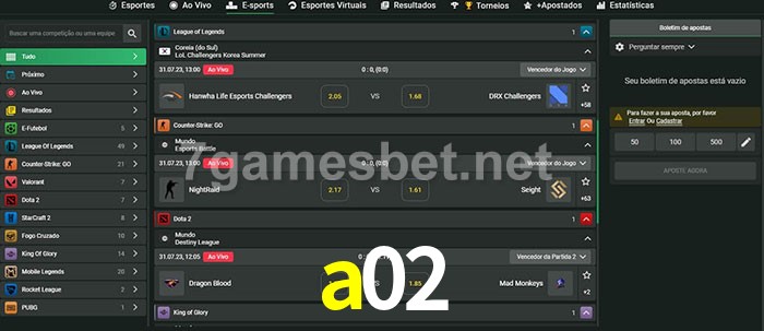 O a02 oferece uma grande seleção de opções de apostas em e-sports com probabilidades competitivas